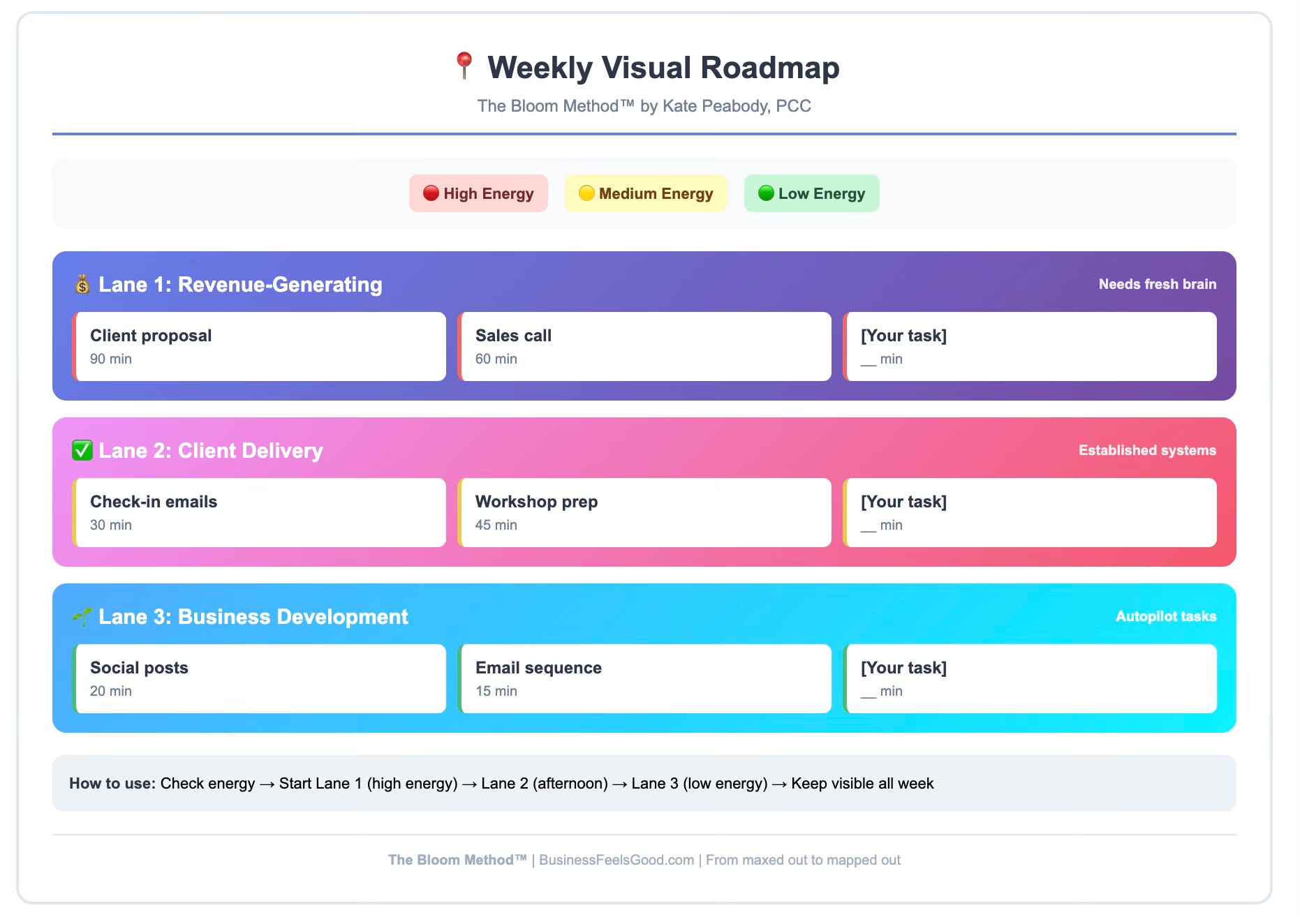 Instead of a to-do list with 47 items, I use a visual canvas with three swimlanes: